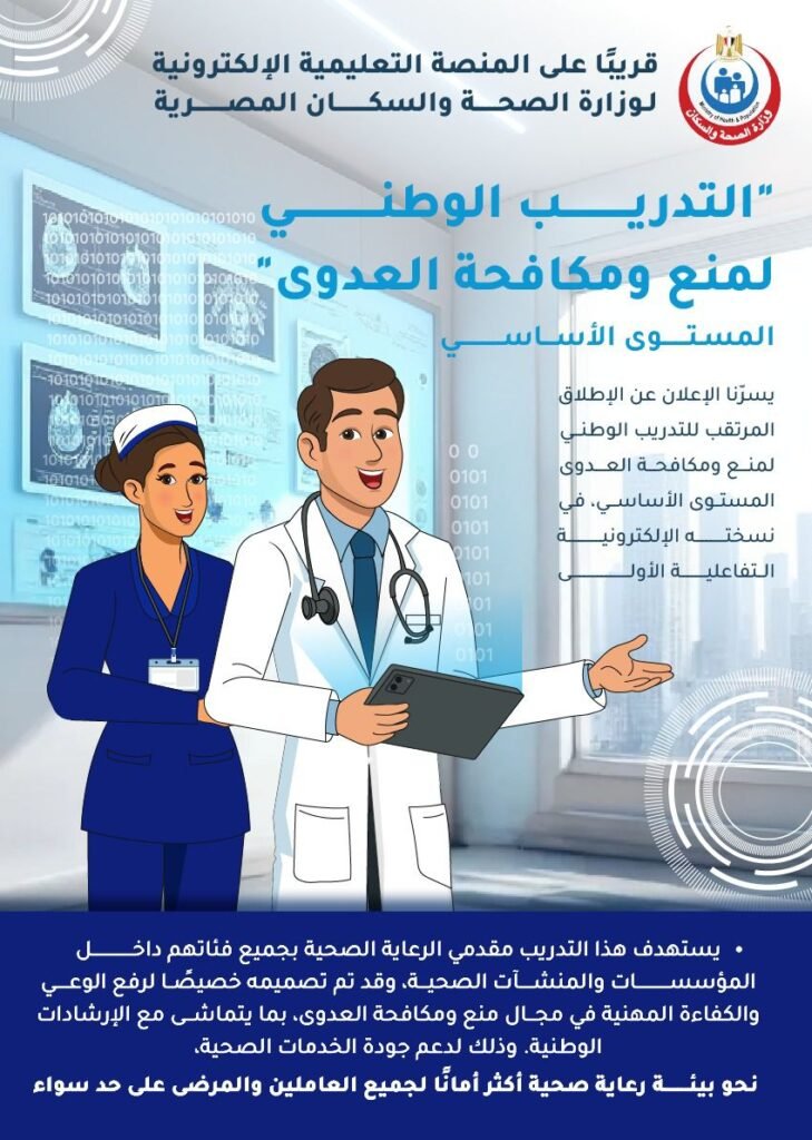 أعلنت وزارة الصحة والسكان بدء الإطلاق المرحلي للمنصة التعليمية الإلكترونية المتخصصة في التدريب الوطني على منع ومكافحة العدوى، وذلك اعتباراً من 20 يناير 2026، موجهة إلى جميع مقدمي الرعاية الصحية بالمنشآت الصحية المختلفة.