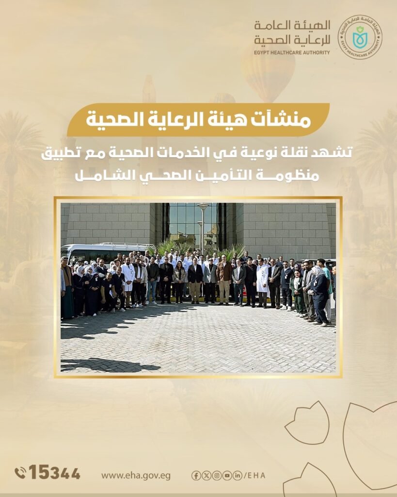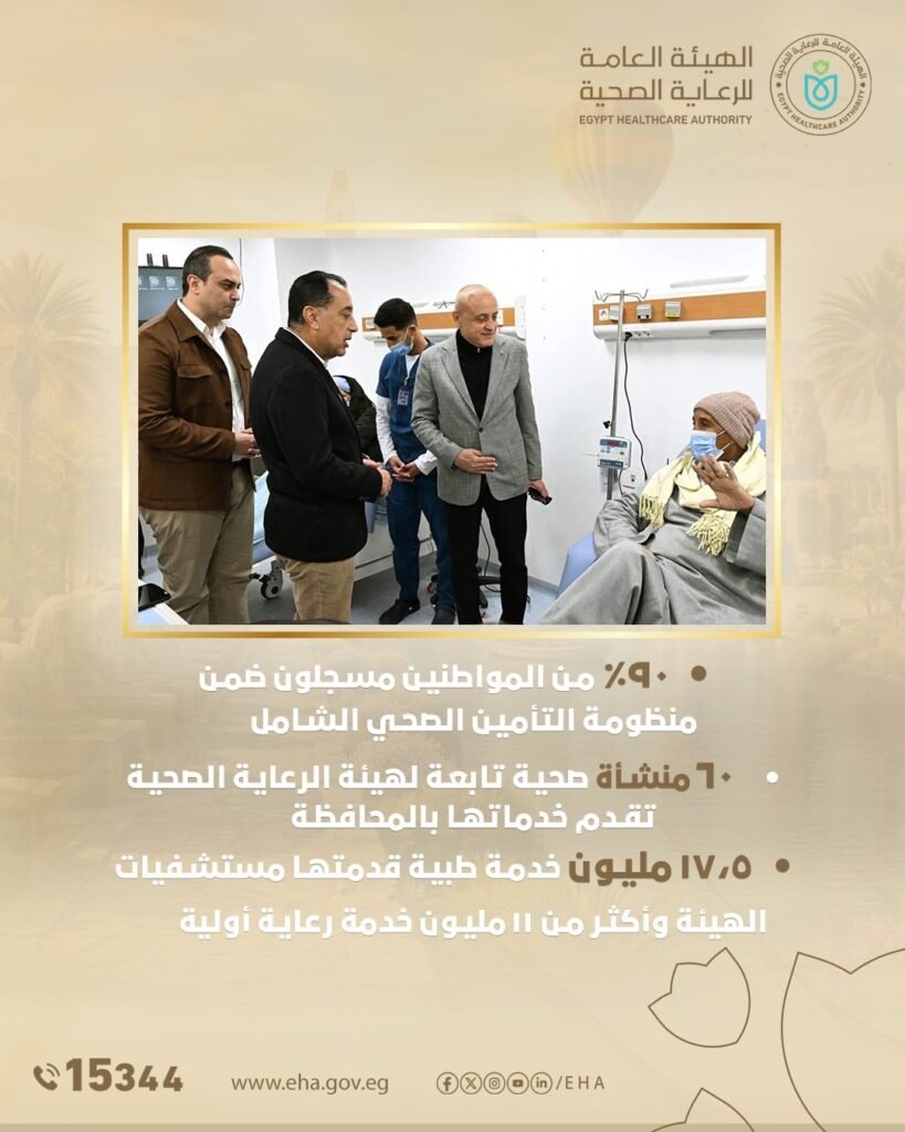 وأكد الدكتور أحمد السبكي، رئيس الهيئة العامة للرعاية الصحية والمشرف العام على مشروع التأمين الصحي الشامل، أن 90% من مواطني محافظة الأقصر مسجلون ضمن منظومة التأمين الصحي الشامل، ويتم تقديم الخدمات الصحية من خلال 60 منشأة صحية تابعة للهيئة بالمحافظة، في مؤشر واضح على اتساع مظلة التغطية الصحية.