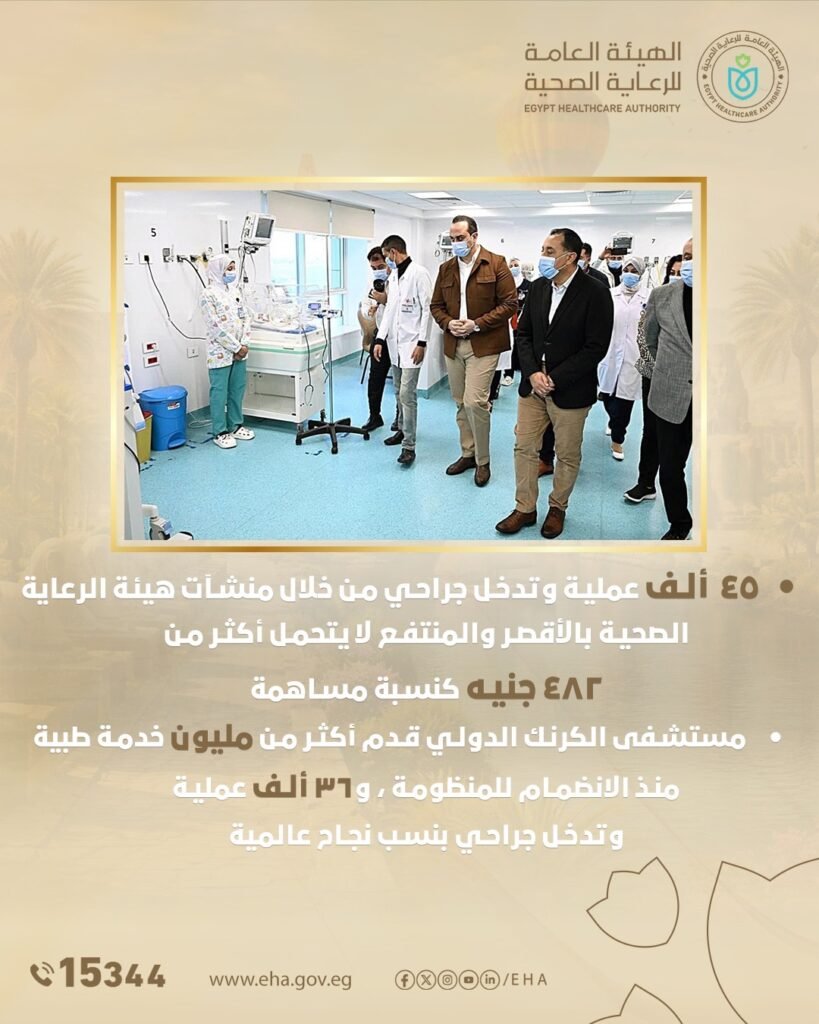 وأشار الإنفوجراف إلى تنفيذ 45 ألف عملية وتدخل جراحي داخل منشآت الهيئة بالمحافظة، مؤكدًا أن المنتفع لا يتحمل أكثر من 482 جنيهًا فقط كنسبة مساهمة، في إطار التزام منظومة التأمين الصحي الشامل بتحقيق الحماية المالية للمواطنين.