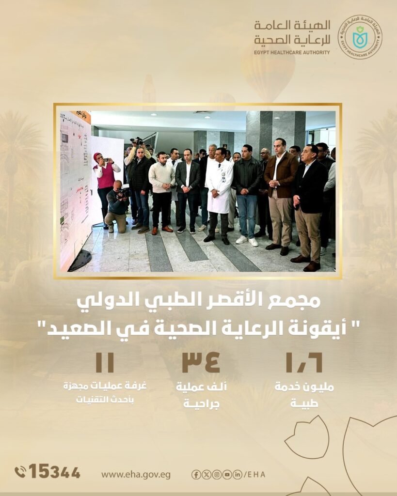 وتناول الإنفوجراف أيضًا دور الهيئة في دعم السياحة العلاجية، حيث تم تقديم خدمات طبية عالية الجودة لنحو 2500 سائح من 56 دولة تحت مظلة العلامة التجارية «نرعاك في مصر»، إلى جانب الدور المحوري لـ مجمع الأقصر الطبي الدولي باعتباره أحد أكبر صروح الرعاية الصحية بالصعيد، بعد تقديمه 1.6 مليون خدمة طبية، وإجراء أكثر من 34 ألف عملية جراحية داخل 11 غرفة عمليات مجهزة بأحدث التقنيات.
